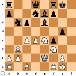 Белые развили фигуры на идеальные для данного варианта позиции. 6. ... Сe6 Лучше было вывести слона на g4. 7. Сb5 a6 8. С:c6+ bc 9. f5 Сd7 10. Фe2 Фb8 11. Кd1 Фb5 12. c3 a5